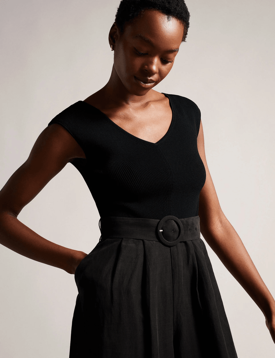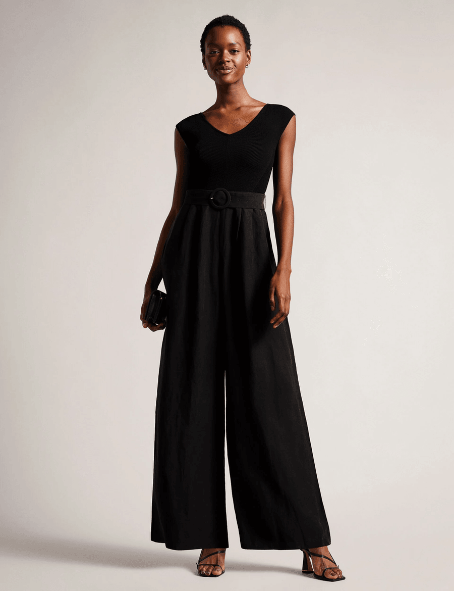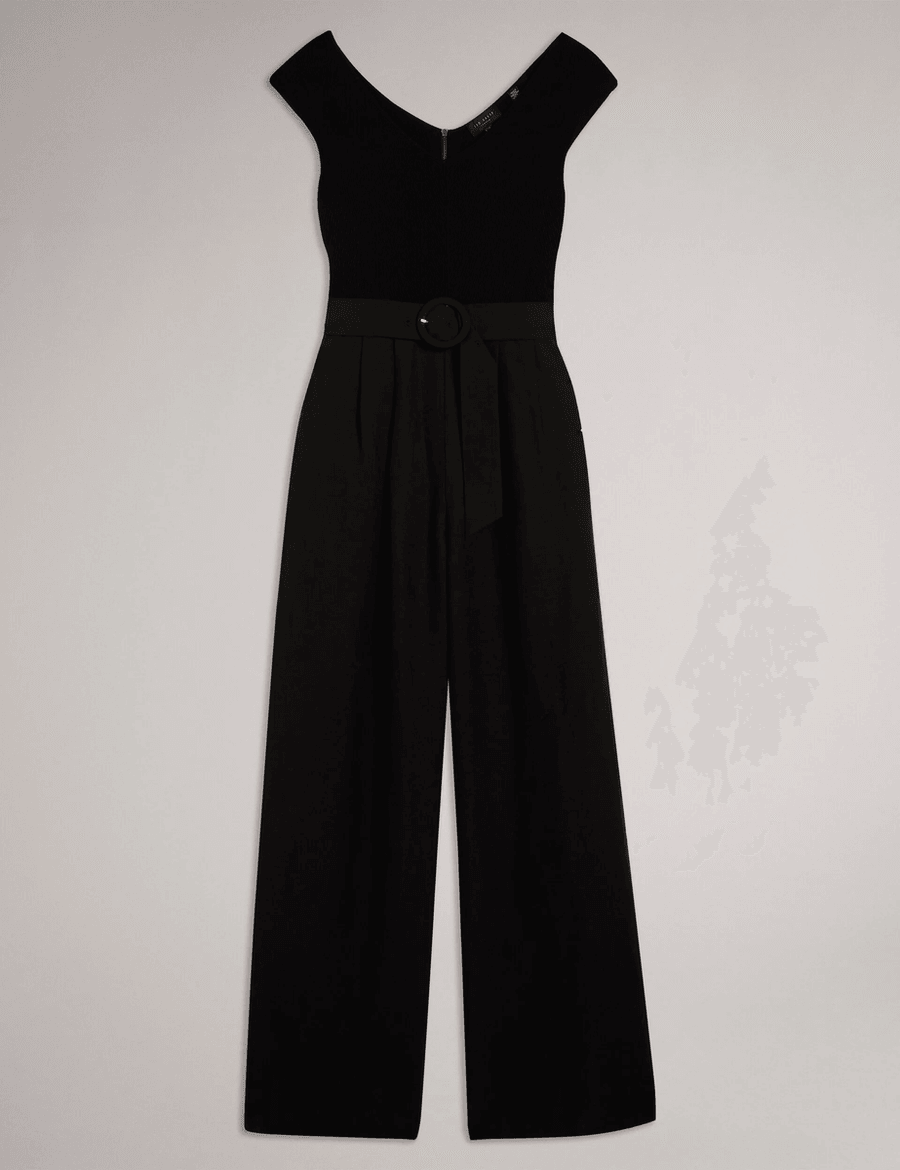 The Ted Baker TABBIAA jumpsuit features a sleeveless design with a stunning wide-leg cut, making it an ideal choice for any season. The unique knitted bodice not only ensures comfort but also offers a flattering fit that accentuates your figure. With a stylish wide V-neck and an elegant O-ring belt, this jumpsuit is perfect for both casual outings and dressier events.