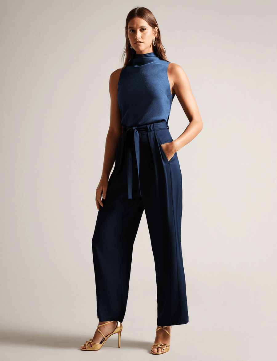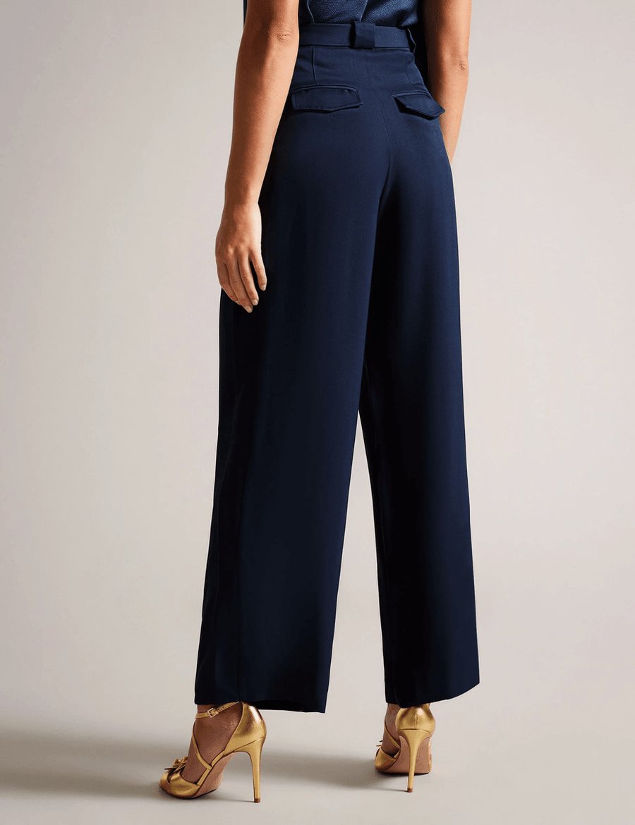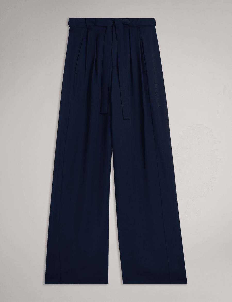The Ted Baker JEMMIAH | DK-NAVY trousers feature a chic wide-leg style that pairs beautifully with both casual and formal tops. The pleated front adds dimension, while the self-tie belt allows you to tailor the fit to your liking. With practical belt loops and pockets, these trousers combine fashion with functionality.