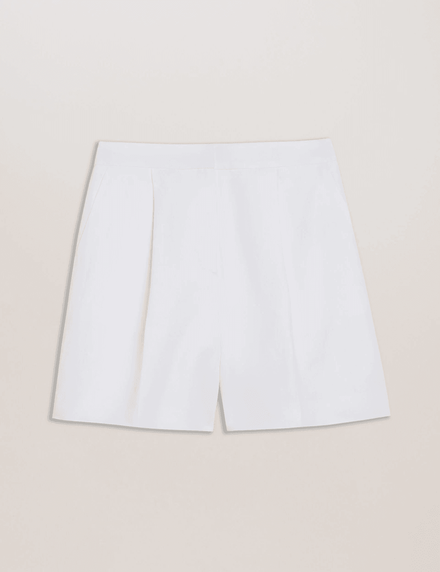 Discover the perfect blend of comfort and sophistication with the Ted Baker MUSUBSH | WHITE tailored shorts. Crafted from a premium linen-cotton blend, these shorts provide a lightweight yet durable option for your warm-weather wardrobe. The high-waisted design and twill texture add a touch of elegance, making them ideal for both casual outings and semi-formal events.