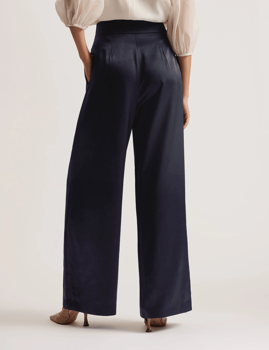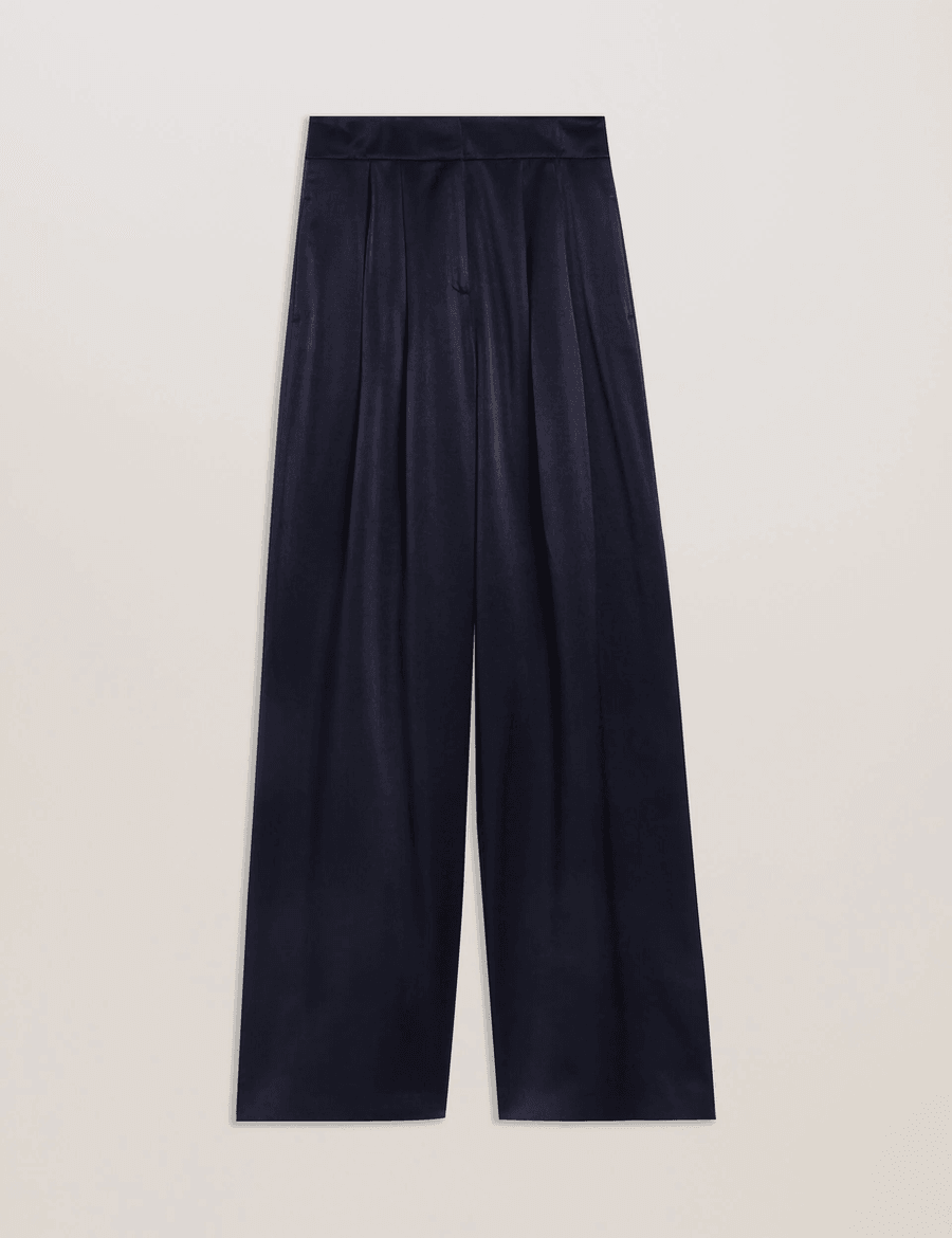 Experience unparalleled elegance with the Ted Baker TEERUT trousers in navy. Designed for the modern woman, these trousers blend glamour and sophistication with a shimmering satin finish and a flowy wide-leg silhouette. Whether you're dressing for a formal event or a night out, the Ted Baker TEERUT is your go-to choice for standout style.