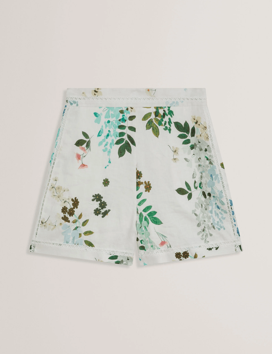 The Ted Baker VYLLA | WHITE shorts are designed for the modern woman who values both style and comfort. With a chic high-waisted fit, these shorts accentuate your waist while offering a relaxed wide-leg design that moves with you. The delicate floral print adds a touch of femininity, perfect for brunch dates or beach outings. The crochet insert trims and side pockets combine elegance with functionality, making these shorts versatile for any occasion.