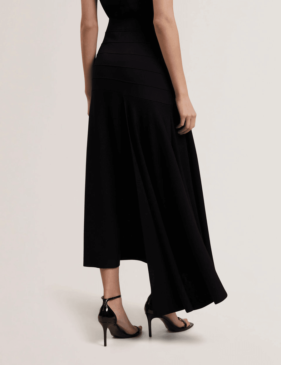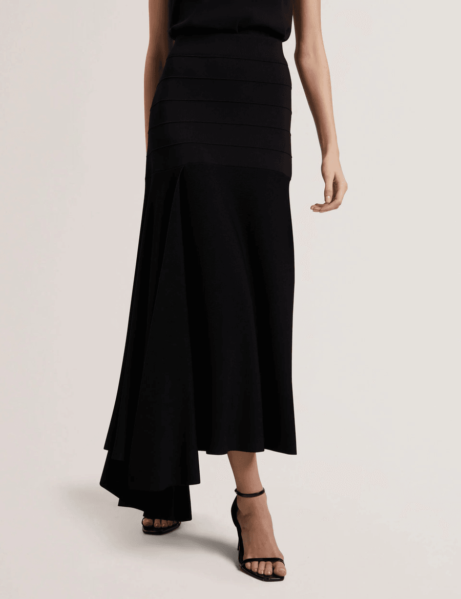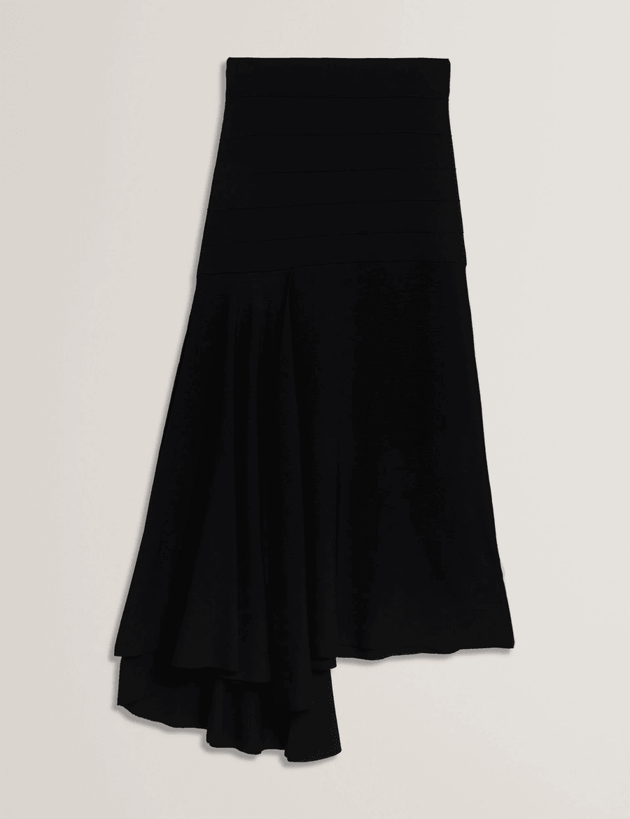 The Ted Baker LAURRIE | BLACK is designed for the modern woman who values both style and comfort. This midi skirt features a sophisticated knitted fabric, offering warmth and versatility for any season. The asymmetric waterfall hem creates dynamic movement, making it perfect for both casual outings and elegant occasions.