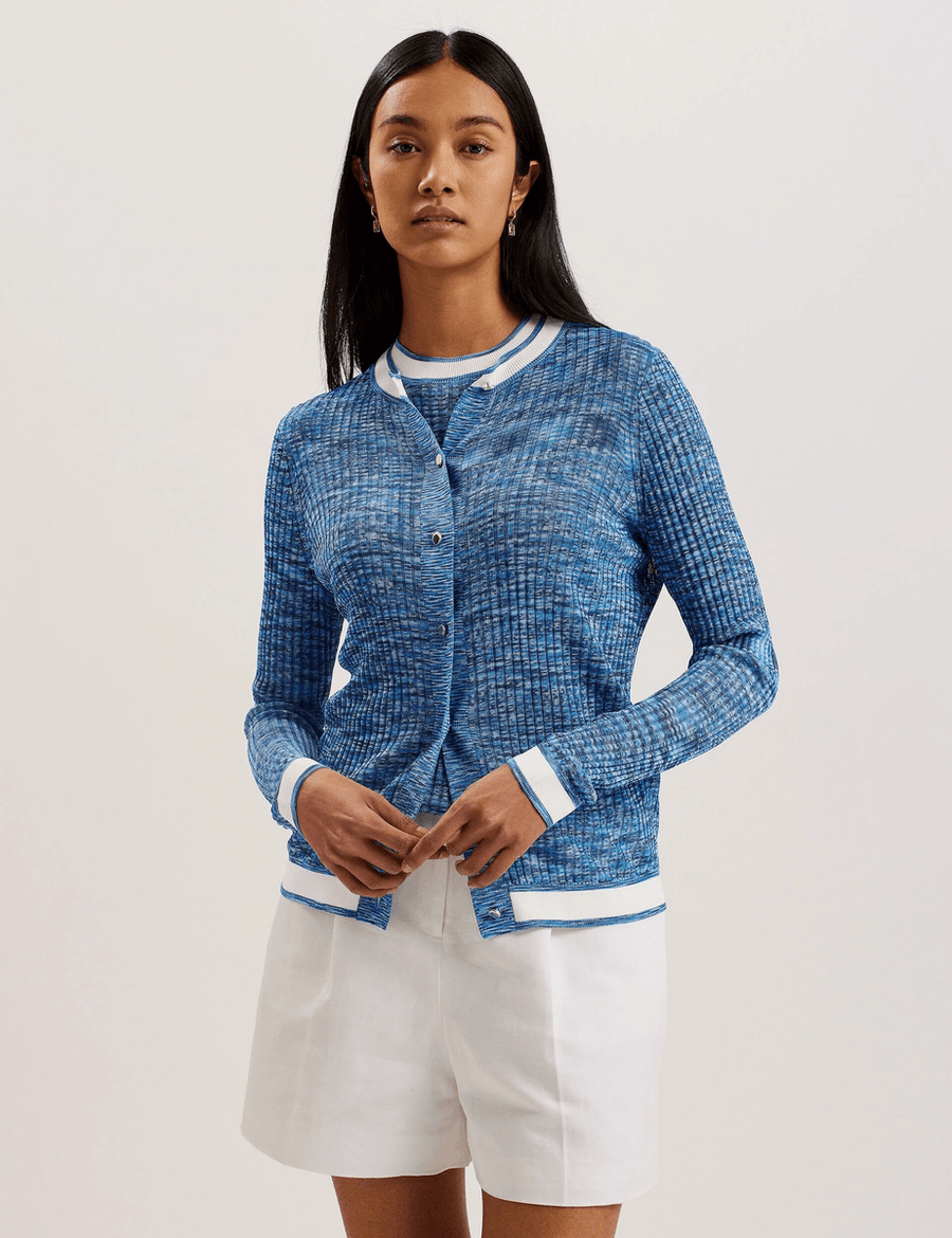 Elevate your wardrobe with the Ted Baker ADDLINN | BLUE, a stylish space-dyed long sleeve cardigan that combines contemporary flair with classic design. This button-front cardigan is not just a piece of clothing; it's a statement.
