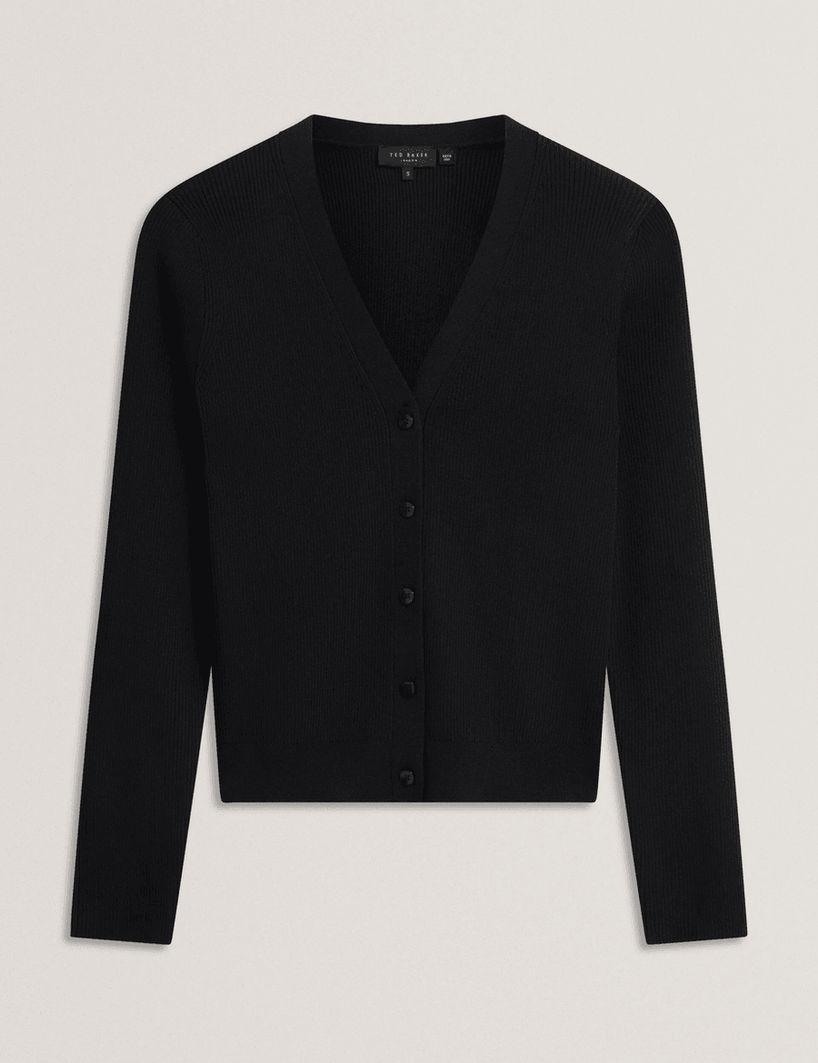 Don’t miss out on this essential wardrobe staple. Shop the Ted Baker V-Neck Cardigan with Rib in Rich Black today and redefine your style with effortless elegance!