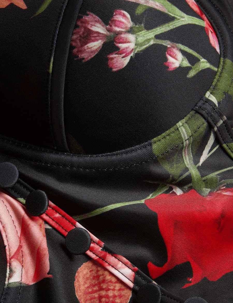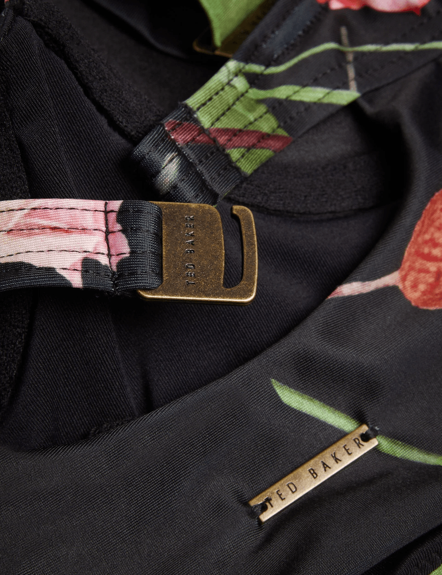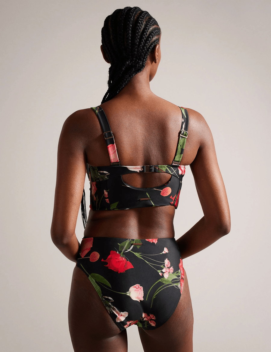 The Ted Baker LUSIYE | BLACK bikini top combines elegance and functionality. With its eye-catching floral pattern and decorative buttons, this bikini top not only flatters your figure but also adds a chic touch to your swimwear collection. The adjustable straps ensure a perfect fit, while the back cut-out design offers a unique style that keeps you cool during sunny days.