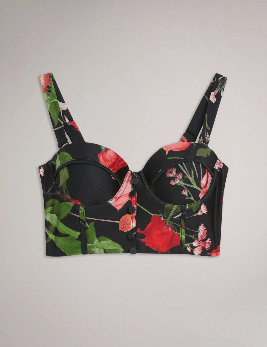 Elevate your beachwear collection with the Ted Baker LUSIYE | BLACK bikini top. This stunning piece features a captivating floral print and a stylish decorative button front, ensuring you stand out during your coastal adventures. Crafted for both comfort and style, the LUSIYE bikini top is designed to turn heads.
