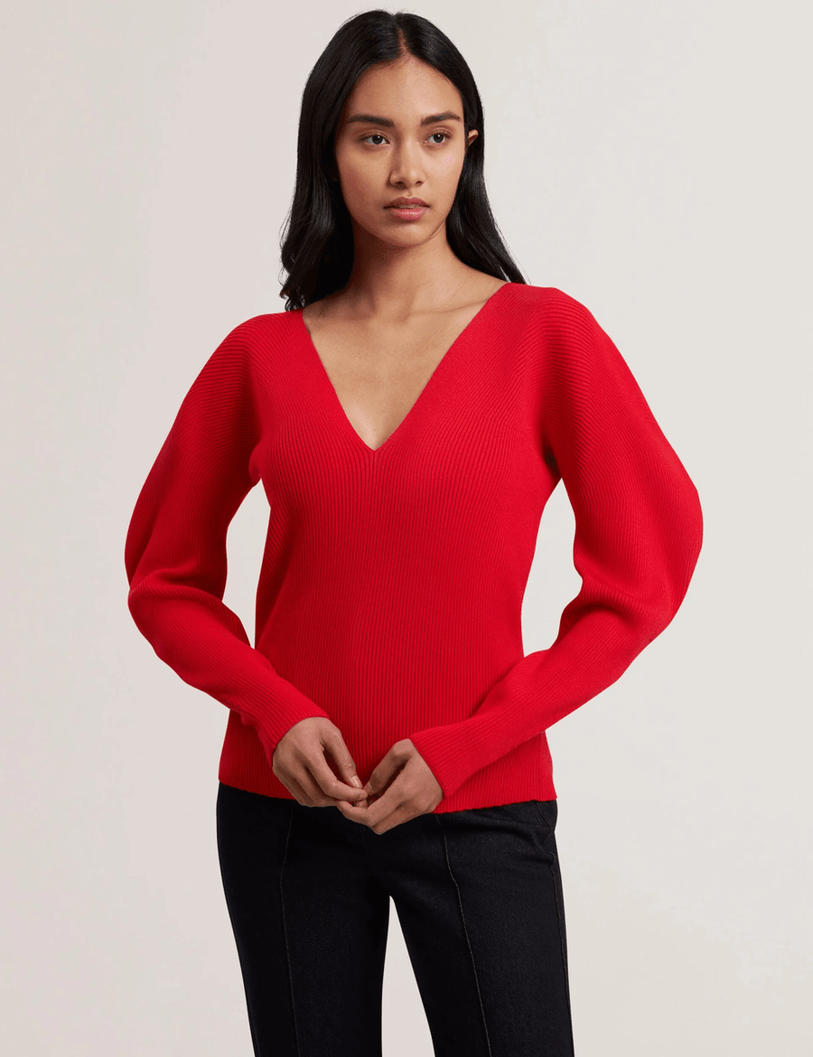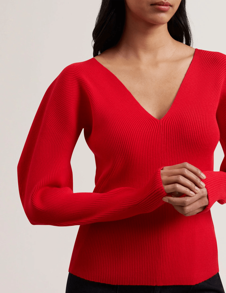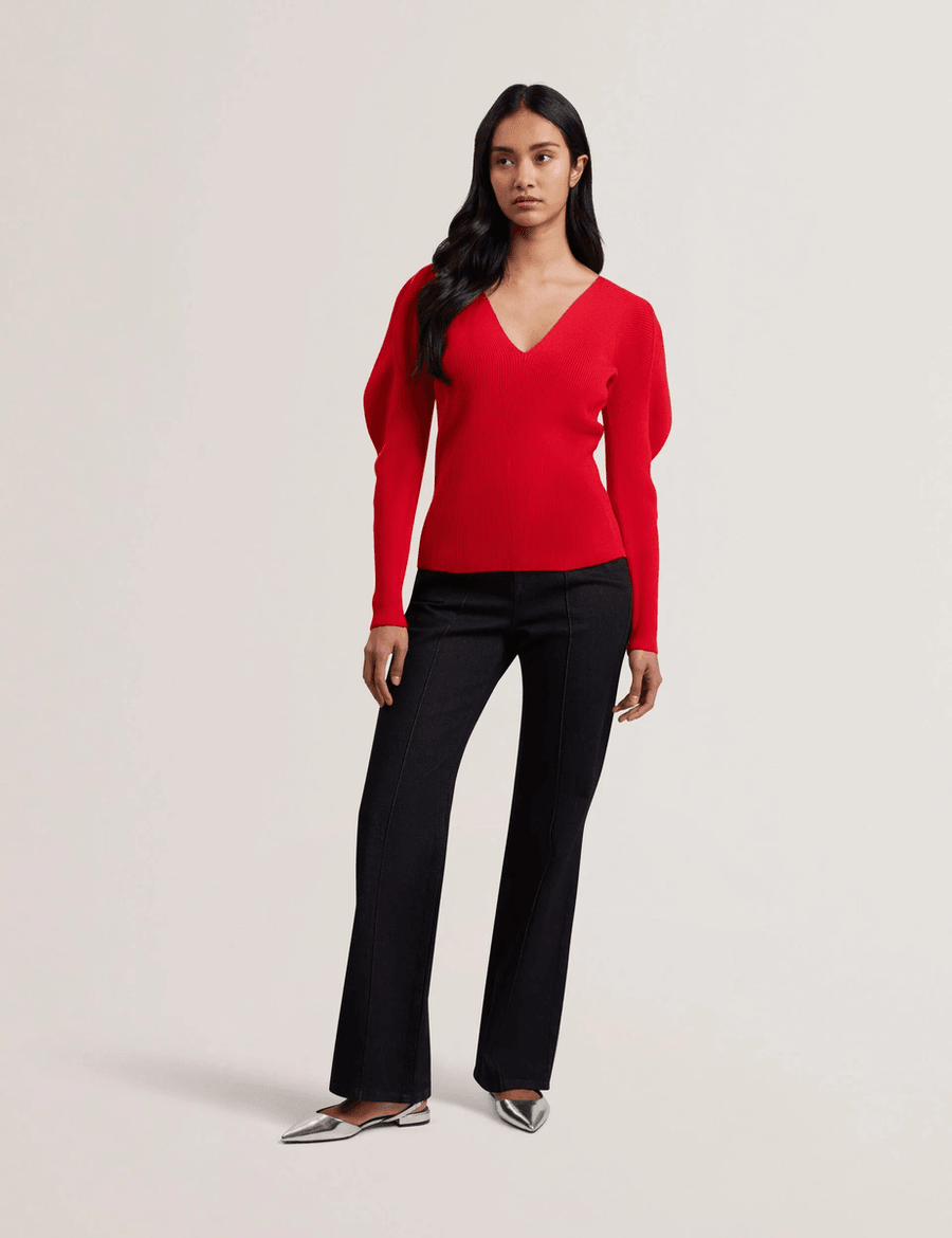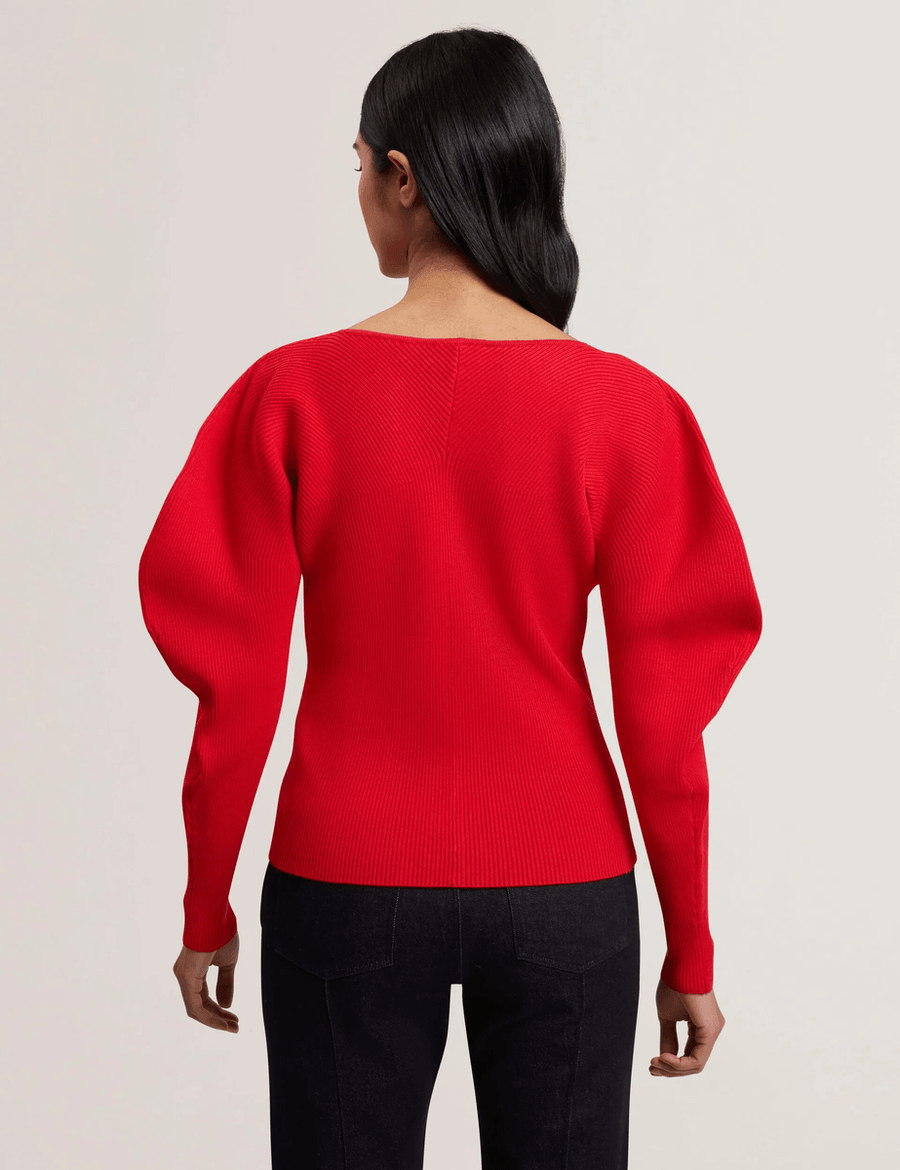 The Ted Baker AMELYAA | BRT-RED is expertly crafted from a luxurious viscose blend knit, offering a soft touch with a breathable feel. The elegant V neckline enhances your neckline while the sculpted puffed long sleeves add a unique flair. Perfect for layering or wearing on its own, this top is versatile enough to pair with your favorite jeans or a stylish skirt.