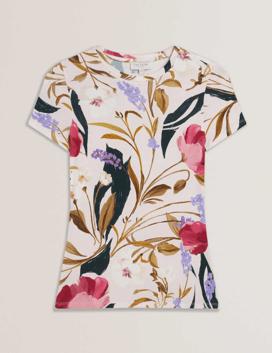 Elevate your wardrobe with the stunning Ted Baker BELLIEA | PL-PINK slim fit t-shirt. Featuring an exquisite all-over floral print, this stylish piece effortlessly combines elegance with comfort, making it a must-have for any fashion-forward individual.
