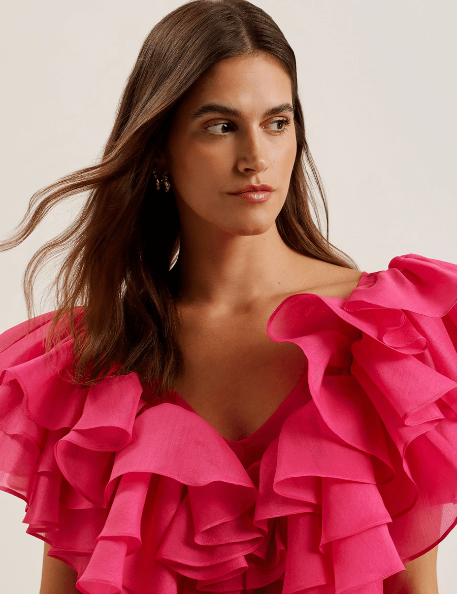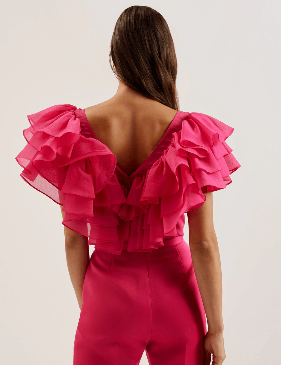 The Ted Baker CALONDA | FUCHSIA features an eye-catching oversized layered frill trim that beautifully frames the body. The v-neckline and angel sleeves combine to create a soft, romantic silhouette, making it ideal for weddings, parties, or any occasion where you want to impress. Crafted from high-quality woven fabric, this top is not only stylish but also comfortable, allowing you to enjoy your event with confidence.