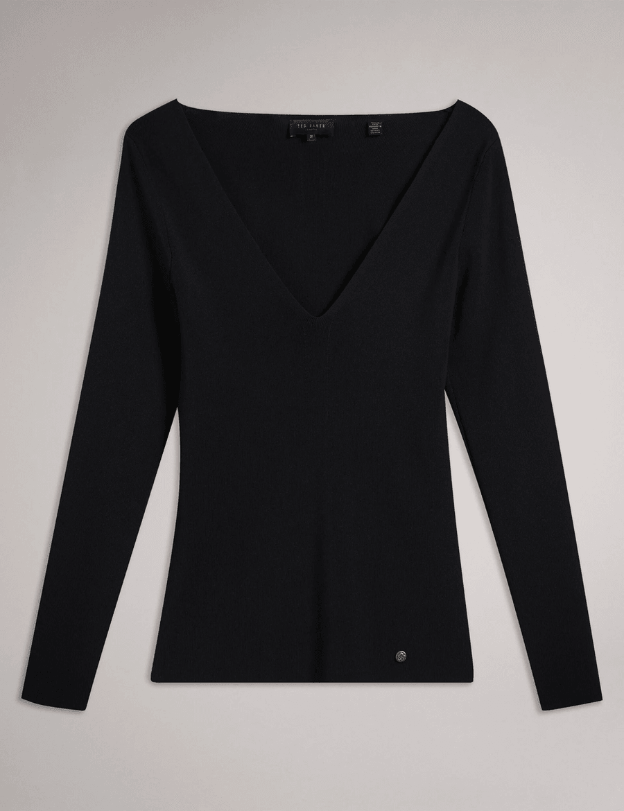 The Ted Baker CILESTE | BLACK features a slim fit that hugs your curves in all the right places. The low v-neckline not only flatters but also makes it easy to layer under jackets or wear alone for a polished look. Whether you're heading to the office or out for a casual evening, this top pairs beautifully with jeans, skirts, or tailored trousers.