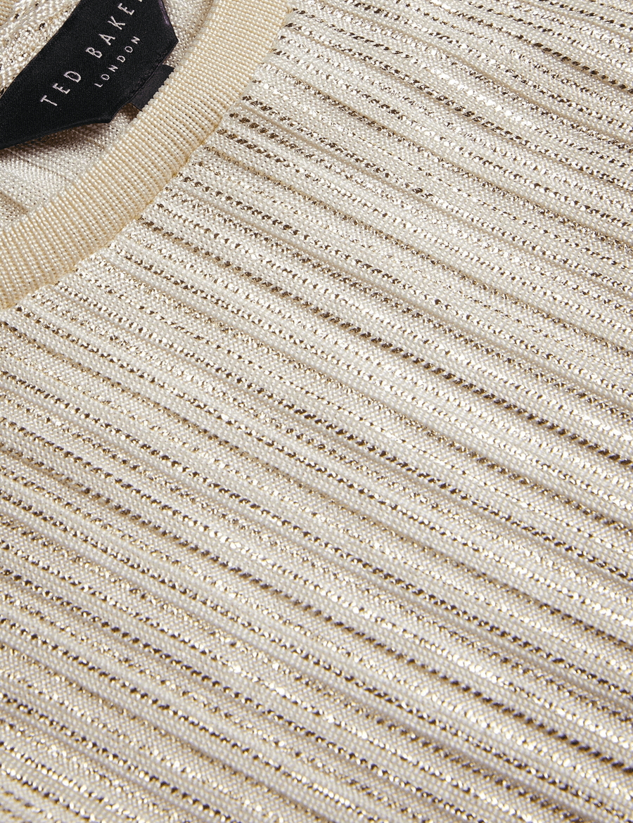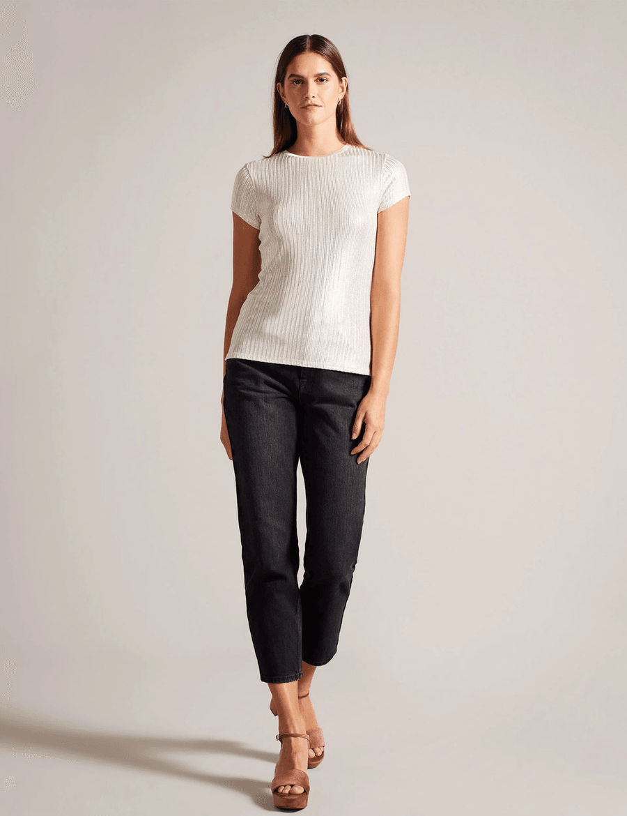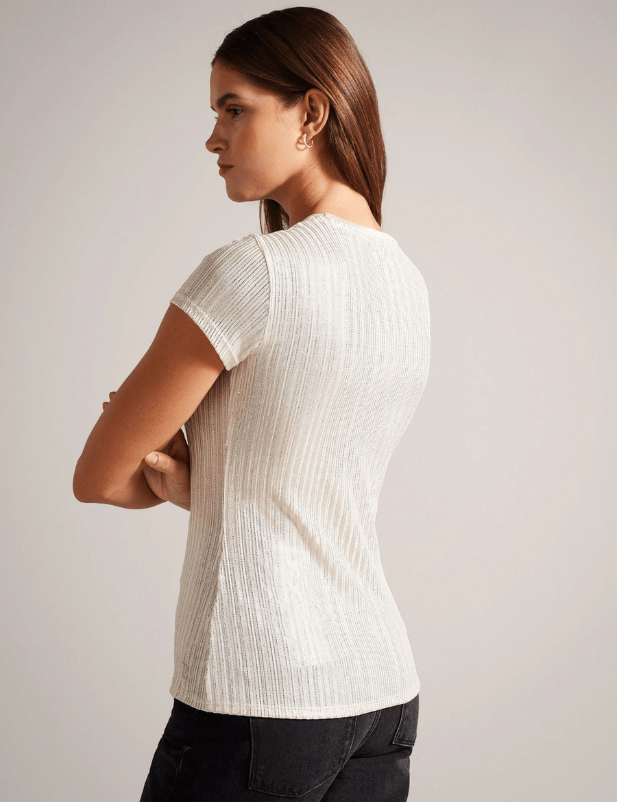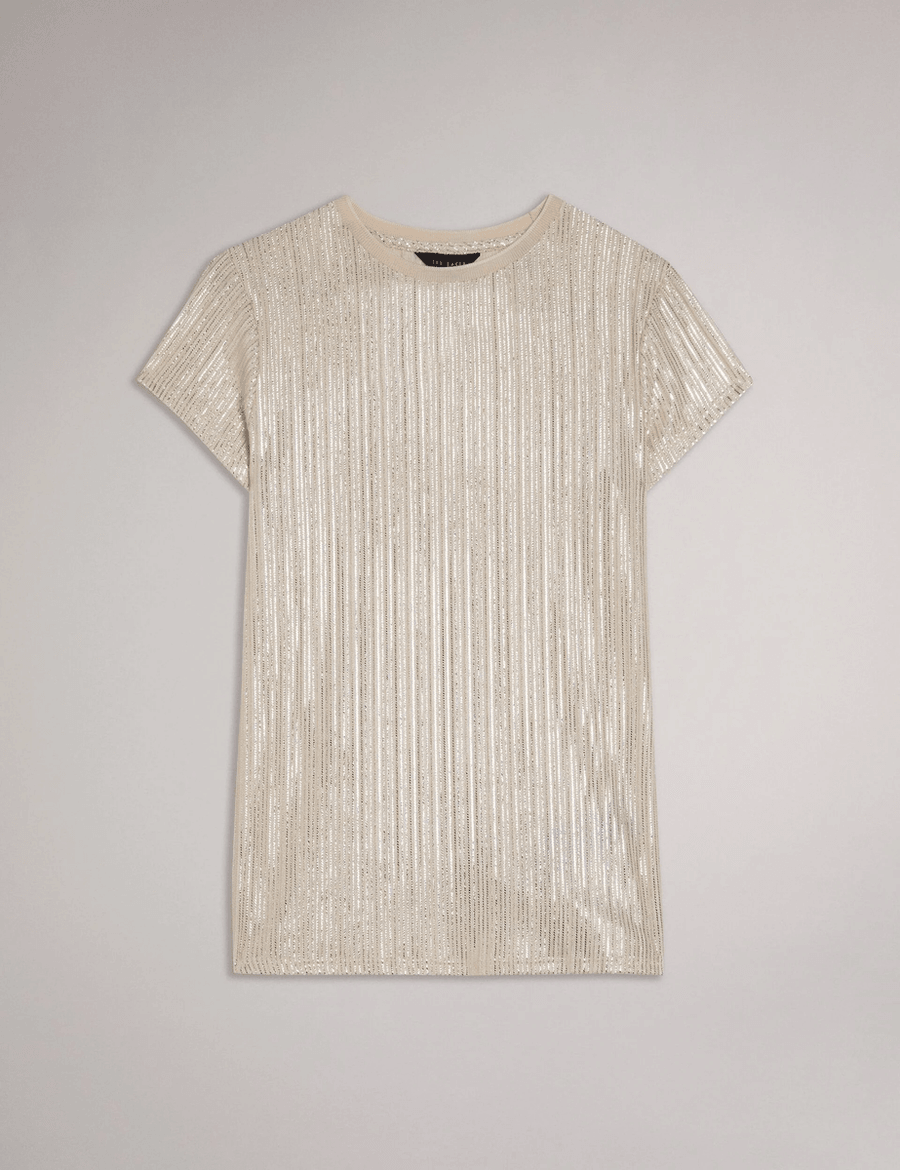Discover the stunning Ted Baker KATRINO | GOLD, where basic meets glamour. This ribbed t-shirt is designed to make you shine, featuring a flattering slim fit that complements any silhouette.