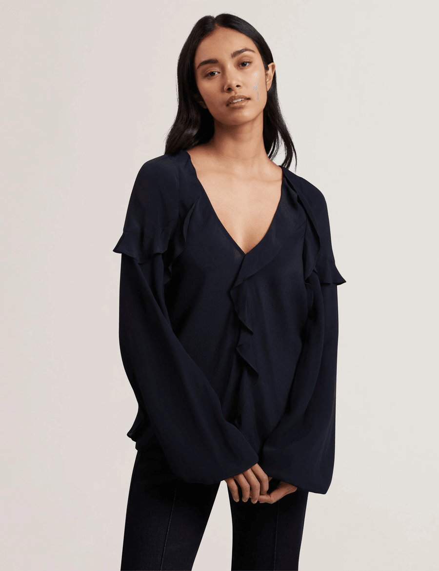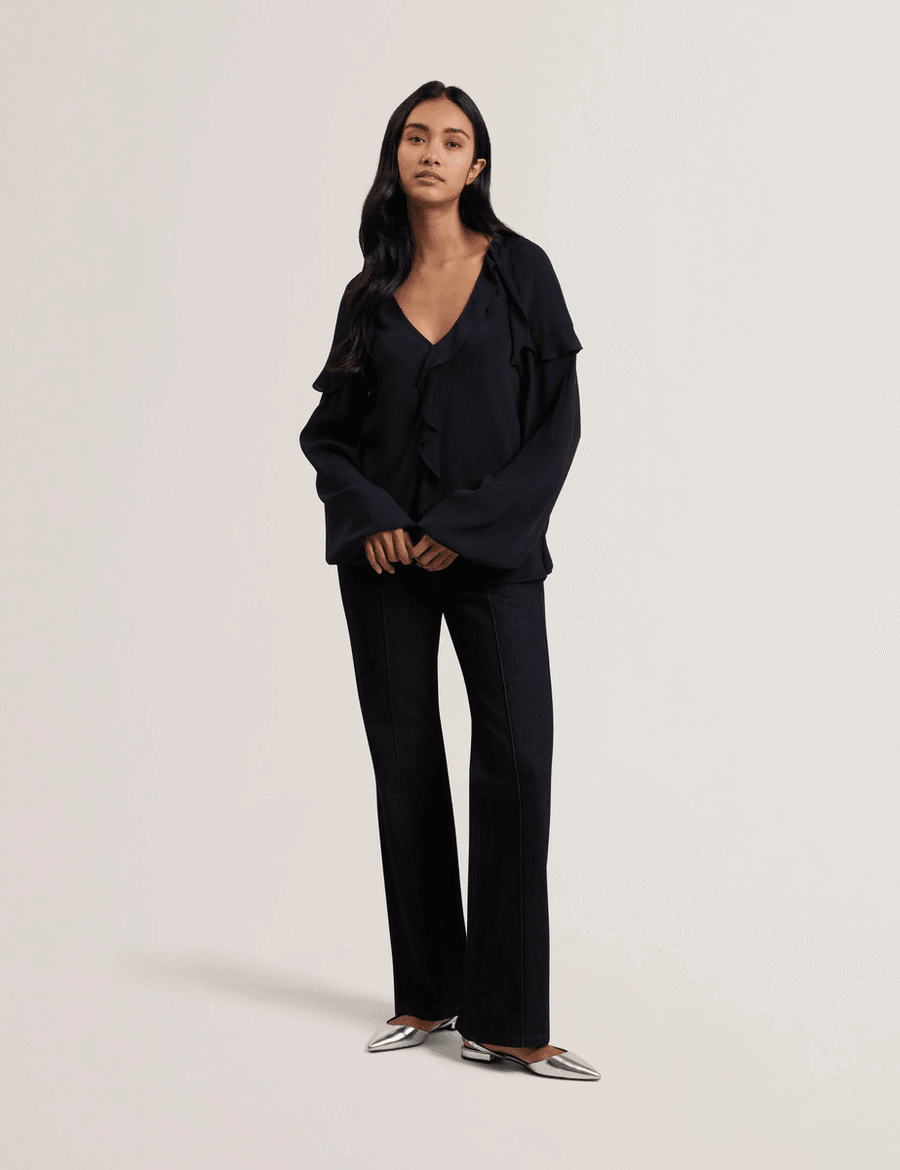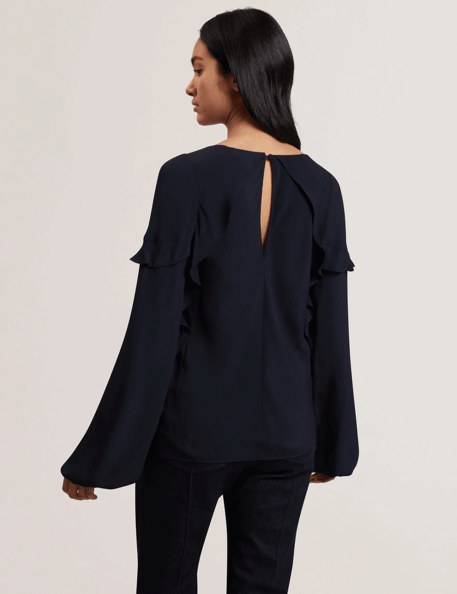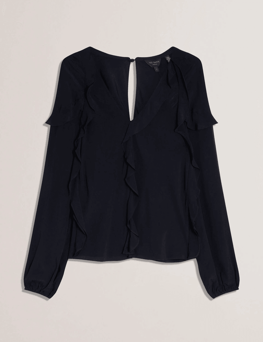 Discover the stunning Ted Baker KAYFA | NAVY blouse, designed to bring a floaty, feminine feel to your ensemble. Perfectly crafted for the modern woman, this blouse features exquisite waterfall ruffles across the bodice and shoulders, creating a captivating silhouette.