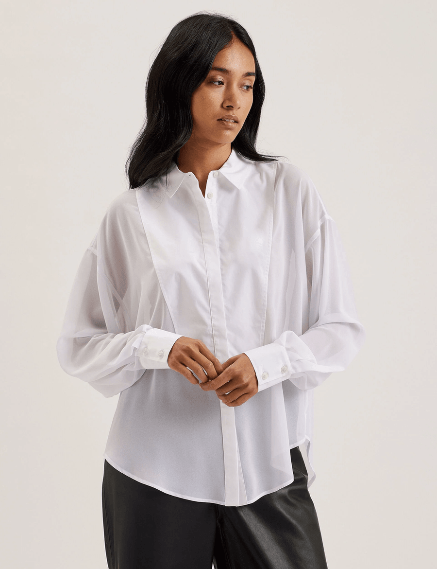 Elevate your wardrobe with the stunning Ted Baker LECHOSA | WHITE blouse. This long sleeve, sheer woven fabric blouse combines sophistication and comfort, making it a perfect choice for any occasion. With its unique bib-style front and chic cotton collar, this blouse is designed to impress.