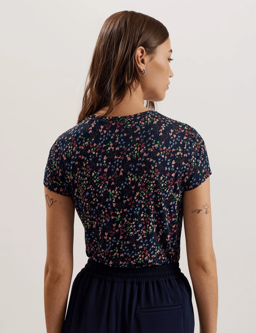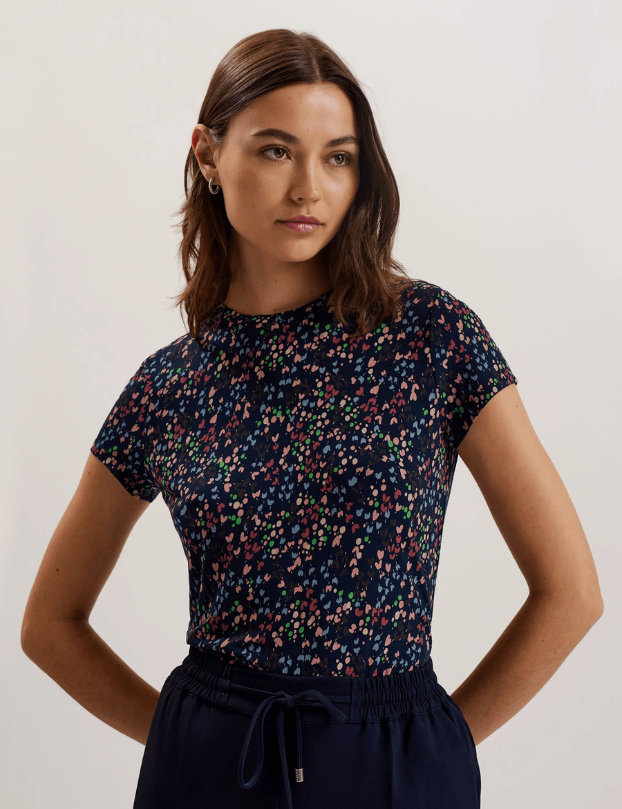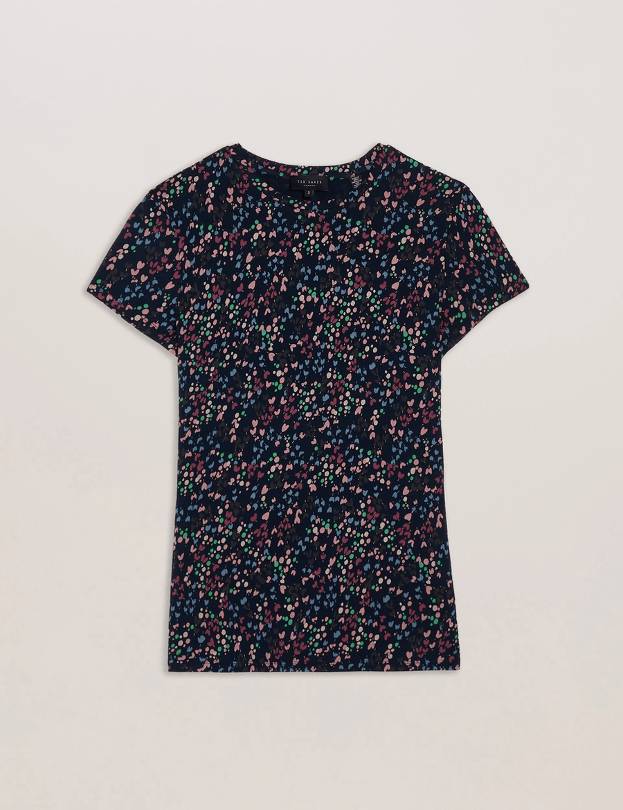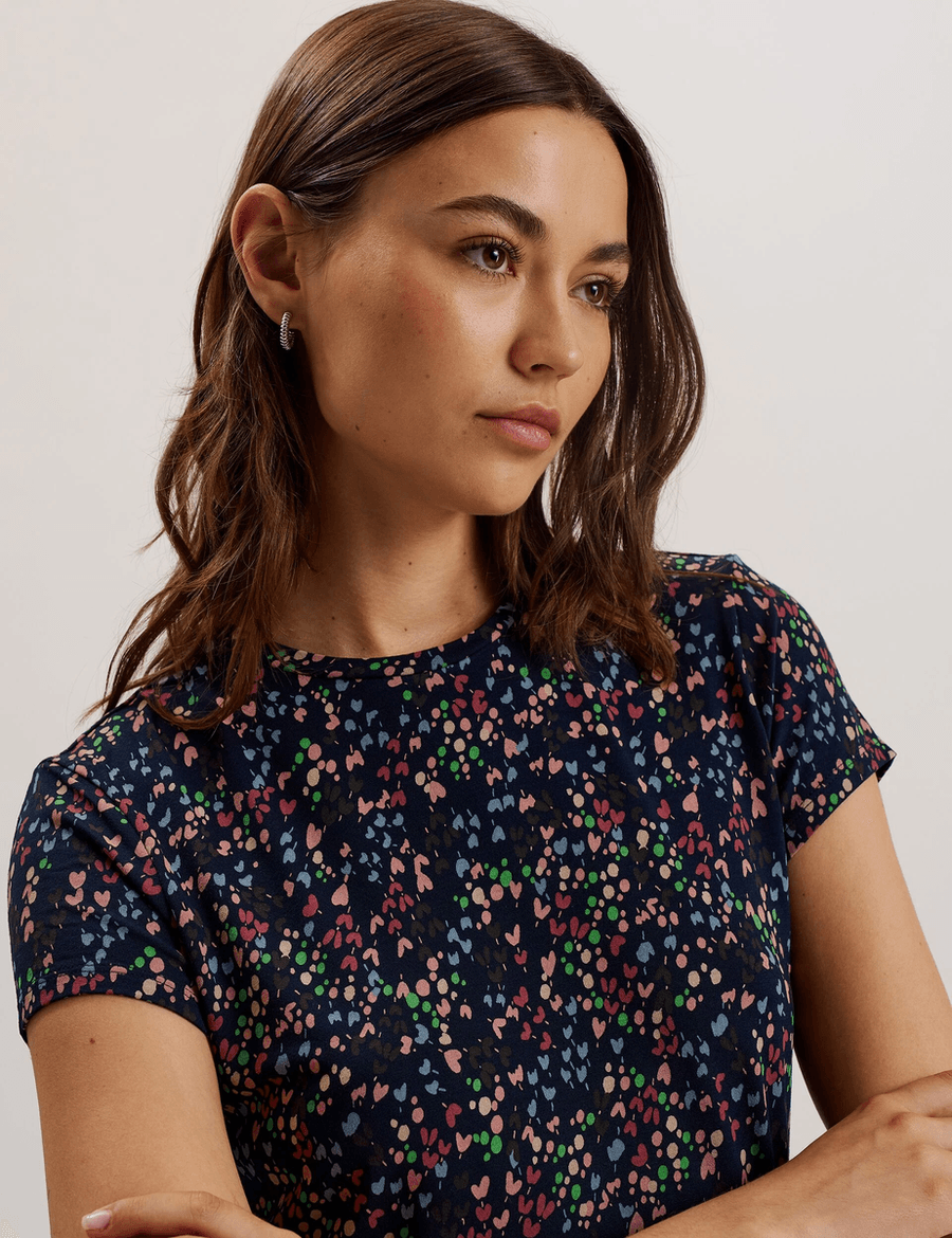 Introducing the Ted Baker REMANAA | NAVY, a must-have tee that lets you express your playful side. With an enchanting heart print, this stylish top is designed to elevate your everyday look. Perfect for any occasion, the REMANAA tee is where comfort meets creativity.