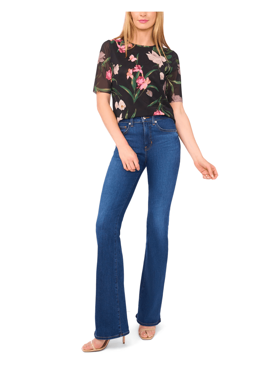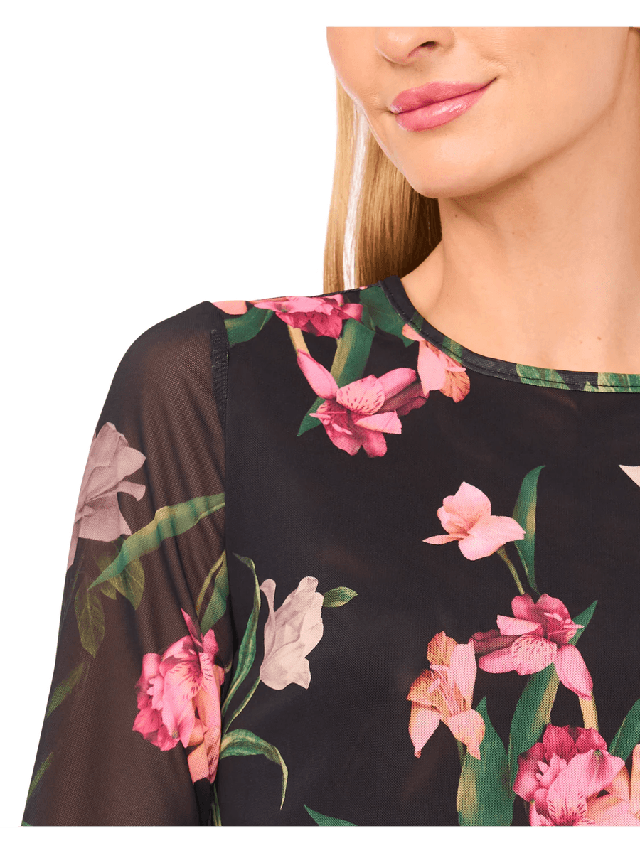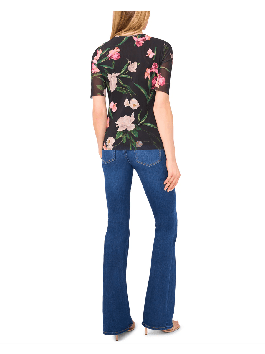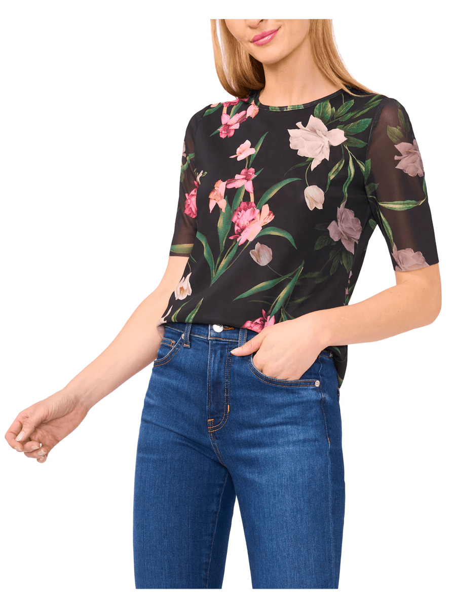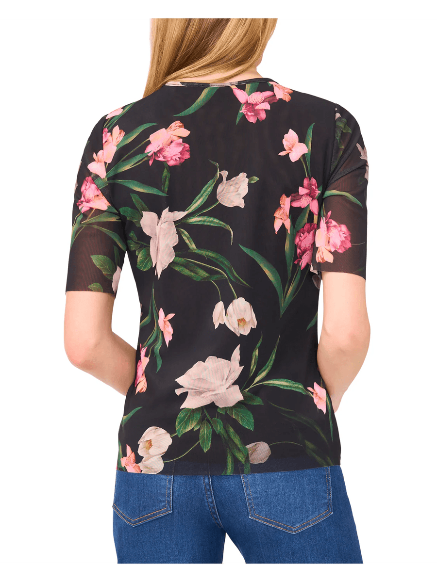 Elevate your style with the Ted Baker SHORT SLEEVE MESH TOP | RICH BLACK. This stunning top seamlessly blends a delicate floral design with breathable mesh fabric, creating a fresh and feminine look perfect for any occasion.