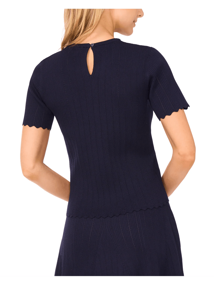 Embrace effortless elegance with the Ted Baker SHORT SLEEVE POINTELLE & RIB TOP | CLASSIC NAVY. This exquisite top is designed for the modern woman who appreciates a sophisticated yet contemporary style. Perfect for any occasion, this top effortlessly elevates your wardrobe.
