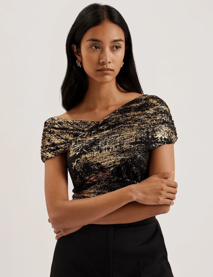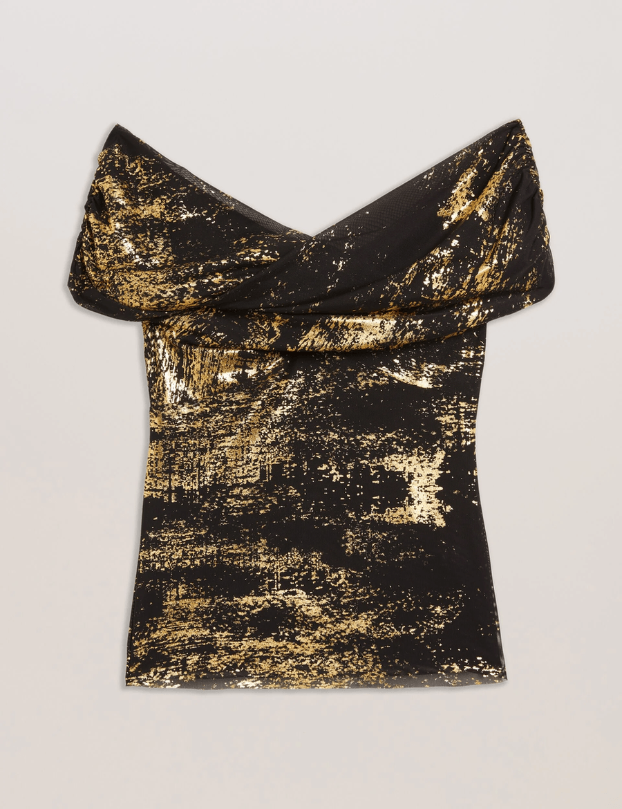 Elevate your evening wardrobe with the Ted Baker TALULAR | BLACK, a stunning mesh top designed to make you shine. With its dazzling abstract foil print, this top is your go-to choice for any celebration, ensuring you stand out under the lights.