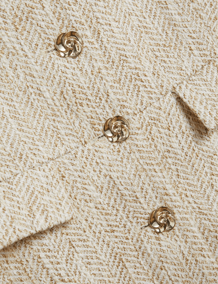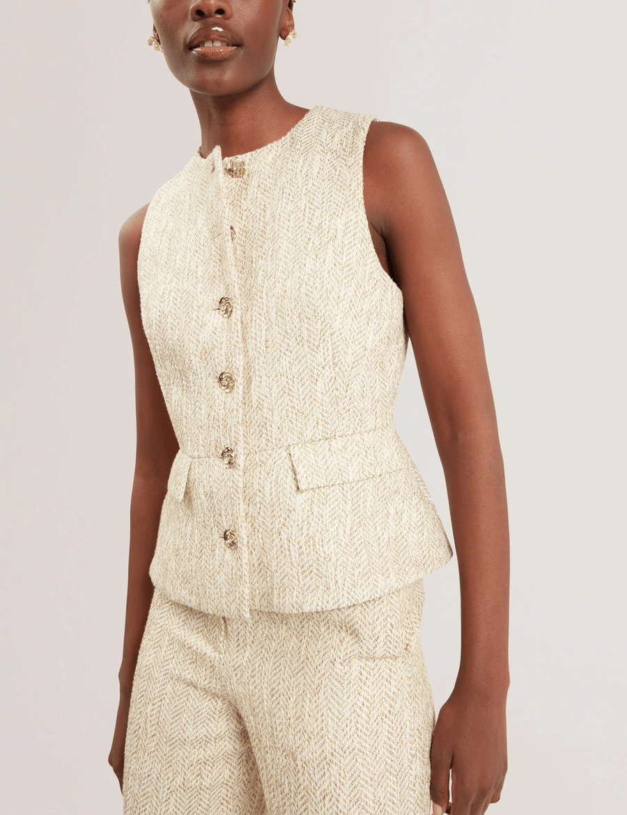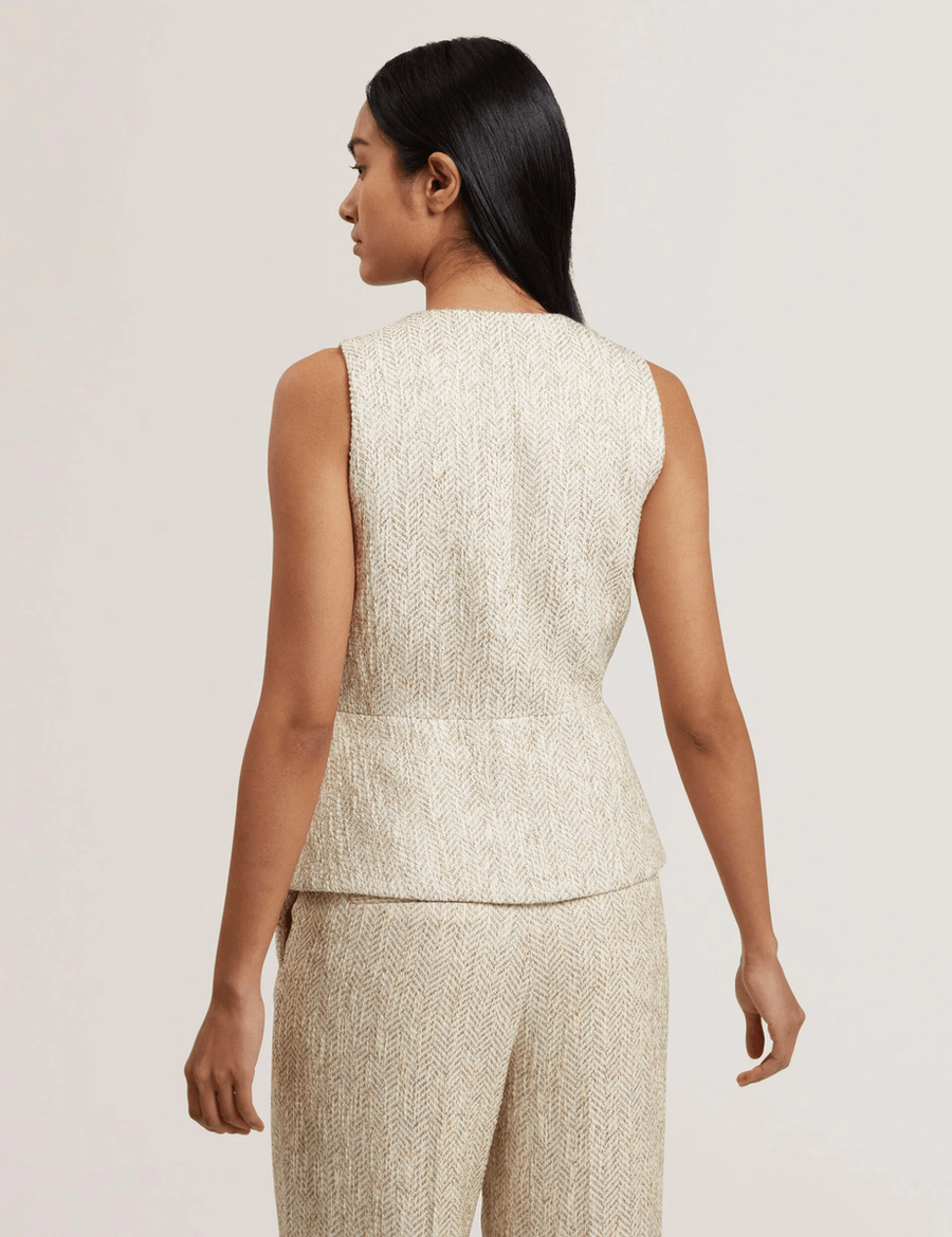 Step into sophistication with the Ted Baker VULPAW | IVORY, a stunning fitted waistcoat designed to enhance your silhouette. Crafted from luxurious boucle fabric, this waistcoat features a unique herringbone texture that adds depth and character to any outfit.
