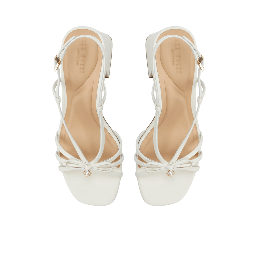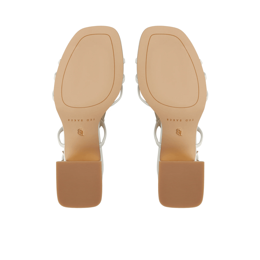 The Ted Baker ELIZA | SOFT-WHITE showcases a square open toe, providing a contemporary look that pairs beautifully with dresses, skirts, or tailored pants. The silver-tone pearl charm hardware adds a touch of sophistication, making these heels perfect for both day and evening wear.